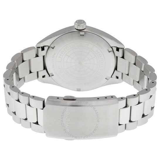 Stainless steel case with a stainless steel bracelet. Fixed stainless steel bezel. Black dial with silver-tone hands and Arabic numeral hour markers. 24 hour (GMT) markings. Minute markers around the outer rim. Dial Type: Analog. Luminescent hands and markers. Date display at the 3 o'clock position. ETA F07.111 quartz movement. Scratch resistant sapphire crystal. Pull / push crown. Solid case back. Case size: 40 mm. Case thickness: 9 mm. Round case shape. Band width: 20 mm. Fold over clasp with a safety release. Water resistant at 50 meters / 165 feet. Functions: date, hour, minute, second. Additional Info: in general, suitable for short periods of recreational swimming, but not diving or snorkeling. Dress watch style. Watch label: Swiss Made. Hamilton Khaki Field Black Dial Stainless Steel Men's Watch H68551133.