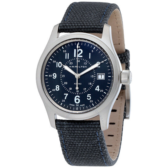Stainless steel case with a blue canvas strap. Fixed stainless steel bezel. Blue dial with luminous silver-tone hands and Arabic numeral hour markers. Arabic numeral minute markers (at 5 minute intervals). 24 hour markers. Minute markers around the outer rim. Dial Type: Analog. Luminescent hands and markers. Date display at the 3 o'clock position. ETA caliber F06.111 quartz movement. Scratch resistant sapphire crystal. Pull / push crown. Solid case back. Case size: 38 mm. Case thickness: 9.25 mm. Round case shape. Fold over clasp. Water resistant at 100 meters / 330 feet. Functions: date, hour, minute, second. Casual watch style. Watch label: Swiss Made. Hamilton Khaki Field Blue Dial Blue Canvas Men's Watch H68201943
