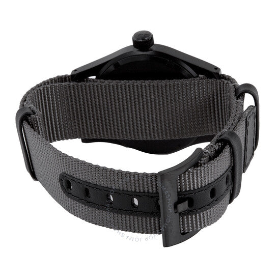Black PVD stainless steel case with a grey textile NATO strap. Fixed black PVD bezel. Black dial with luminous silver-tone hands and Arabic numeral hour markers. 24 hour markers. Minute markers around the outer rim. Dial Type: Analog. Luminescent hands and markers. Hamilton calibre H-50 hand wind movement, based upon ETA 2801-2, containing 17 Jewels, bitting at 21600 vph, and has a power reserve of approximately 80 hours. Scratch resistant sapphire crystal. Pull / push crown. Solid case back. Round case shape. Case size: 38 mm. Case thickness: 9.5 mm. Band width: 20 mm. Tang clasp. Water resistant at 50 meters / 165 feet. Functions: hour, minute, second. Military watch style. Watch label: Swiss Made. Hamilton Khaki Field Hand Wind Black Dial Watch H69409930.