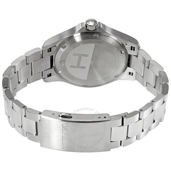 Stainless steel case with a stainless steel bracelet. Fixed stainless steel bezel. Black dial with luminous silver-tone hands and Arabic numeral hour markers. 24 hour markers. Arabic numeral minute markers (at 5 minute intervals). Minute markers around the outer rim. Dial Type: Analog. Luminescent hands and markers. Day of the week and date display centered on the 12 o'clock position. ETA caliber 955.132 quartz movement. Scratch resistant sapphire crystal. Solid case back. Round case shape. Case size: 40 mm. Case thickness: 11 mm. Band width: 20 mm. Fold over clasp. Water resistant at 50 meters / 165 feet. Functions: date, day, hour, minute, second, battery eol indicator. Khaki Field King Series. Military watch style. Hamilton Khaki Field King Quartz Black Dial Men's Watch H64451133.