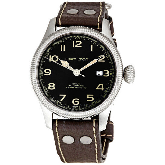 Stainless steel case with a brown (calfskin) leather strap with contrast stiching . Fixed stainless steel bezel. Black dial with silver-tone hands and Arabic numeral hour markers. Minute markers around the outer rim. Date display appears at the 3 o'clock position. Mechanical-hand-wind movement. Scratch resistant sapphire crystal. Screw in case back. Case diameter: 43 mm. Case thickness: 12 mm. Tang clasp. Water resistant at 100 meters/ 330 feet. Functions: hours, minutes, seconds, calendar. Hamilton Khaki Field Team Earth Men's Watch H60455533.