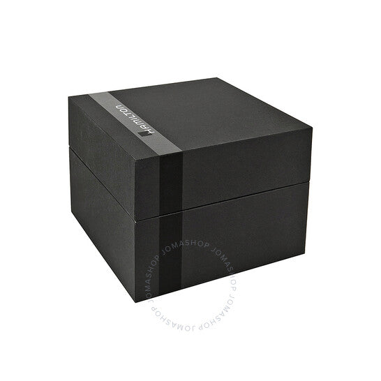 Stainless steel case with a stainless steel bracelet. Rotating stainless steel bezel with black ion-plated top ring. Black dial with luminous silver-tone hands and Arabic numeral hour markers. Minute markers. 24 hour (GMT) scale around an inner ring. Dial Type: Analog. Luminescent hands. Date display appears at the 6 o'clock position. Day of the week displayed centered on the 12 o'clock position. ETA 2834-2 automatic movement with a 38-hour power reserve. Scratch resistant sapphire crystal. Screw down crown. Skeleton case back. Case size: 41 mm. Case thickness: 13.75 mm. Round case shape. Band width: 20 mm. Band length: 7 inches. Deployment clasp. Water resistant at 100 meters/ 330 feet. Functions: hours, minutes, seconds, date. Dress watch style. Watch label: Swiss Made. Hamilton Khaki King Scuba Black Dial Automatic Men's Watch H64515133.