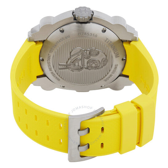 Grey titanium case with a yellow rubber strap. Uni-directional rotating grey bezel. Black dial with silver-tone hands and index hour markers. Minute scale around the inner rim. Dial Type: Analog. Luminescent hands and markers. Hamilton Calibre H-10 Automatic movement, based upon ETA C07.111, containing 25 Jewels, bitting at 21600 vph, and has a power reserve of approximately 80 hours. Scratch resistant sapphire crystal. Screw down crown. Solid case back. Round case shape, case size: 46 mm, case thickness: 15.7 mm. Band width: 24 mm. Buckle clasp. Water resistant at 100 meters / 330 feet. Functions: hour, minute, second. Khaki Navy Series. Sport watch style. Watch label: Swiss Made. Hamilton Khaki Navy Automatic Black Dial Men's Watch H78535380.