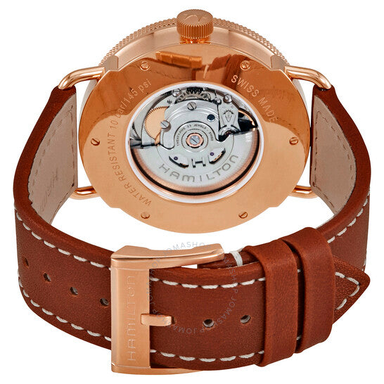 Rose gold PVD stainless steel case with a brown leather strap. Fixed rose gold PVD bezel. Silver dial with rose gold-tone hands and Arabic numeral hour markers. Minute markers. Arabic numeral minute markers (at 5 minute intervals) around the outer rim. Dial Type: Analog. Date display at the 3 o'clock position. One subdial displaying: small seconds. Hamilton calibre H-32 automatic movement with an 80-hour power reserve. Scratch resistant sapphire crystal. Screw down crown. Transparent case back. Round case shape. Case size: 43 mm. Case thickness: 12.55 mm. Band width: 22 mm. Tang clasp. Water resistant at 100 meters / 330 feet. Functions: date, hour, minute, second. Khaki Series. Dress watch style. Watch label: Swiss Made. Hamilton Khaki Navy Pioneer Automatic Silver Dial Men's Watch H77745553.