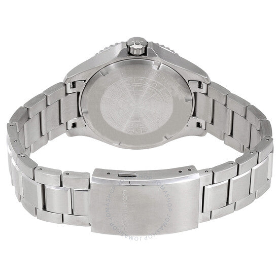 Stainless steel case with a stainless steel bracelet. Uni-directional rotating stainless steel bezel with a black and orange top ring. Black dial with luminous silver-tone dauphine-style hands and index hour markers. 24 hour markers. Minute markers around the outer rim. Dial Type: Analog. Luminescent hands and markers. Date display between the 4 and 5 o'clock positions. Hamilton calibre H-10 automatic movement, based upon ETA C07.111, containing 25 Jewels, bitting at 21600 vph, and has a power reserve of approximately 80 hours. Scratch resistant sapphire crystal. Screw down crown. Solid case back. Round case shape. Case size: 40 mm. Case thickness: 12 mm. Band width: 20 mm. Fold over clasp with a safety release. Water resistant at 100 meters / 330 feet. Functions: date, hour, minute, second, 24 hours. Khaki Navy Scuba Series. Casual watch style. Watch label: Swiss Made. Hamilton Khaki Navy Scuba Automatic Black Dial Men's Watch H82305131.