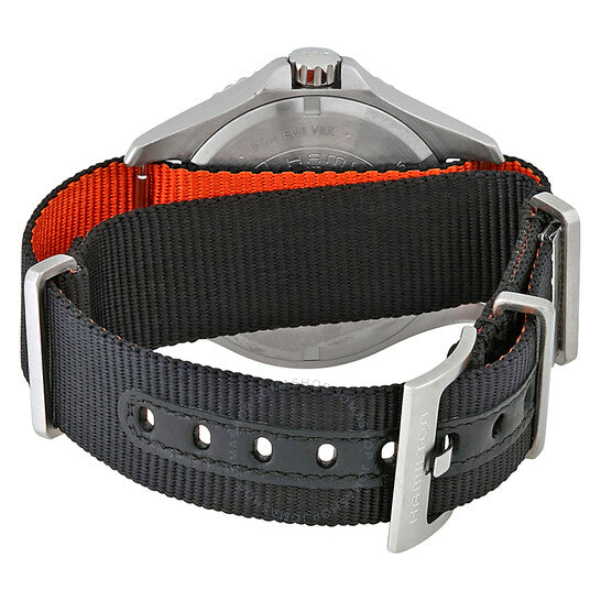 Stainless steel case with a black nylon NATO strap. Uni-directional rotating stainless steel bezel with a black and orange aluminium ring. Black dial with luminous silver-tone dauphine-style hands and index hour markers. 24 hour markers. Minute markers around the outer rim. Dial Type: Analog. Luminescent hands and markers. Date display between the 4 and 5 o'clock positions. Hamilton calibre H-10 automatic movement, based upon ETA C07.111, containing 25 Jewels, bitting at 21600 vph, and has a power reserve of approximately 80 hours. Scratch resistant sapphire crystal. Screw down crown. Solid case back. Round case shape. Case size: 40 mm. Case thickness: 13 mm. Band width: 20 mm. Tang clasp. Water resistant at 100 meters / 330 feet. Functions: date, hour, minute, second, 24 hour. Khaki Navy Scuba Series. Dress watch style. Watch label: Swiss Made. Hamilton Khaki Navy Scuba Automatic Black Dial Men's Watch H82305931.