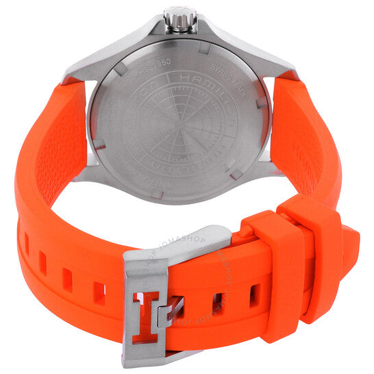 Silver-tone stainless steel case with a orange rubber strap. Uni-directional rotating black ceramic bezel. Black dial with silver-tone hands and index hour markers. Minute markers around the outer rim. Dial Type: Analog. Luminescent hands and markers. Date display between 4 and 5 o'clock position. Hamilton Calibre H-10 Automatic movement, based upon ETA C07.111, containing 25 Jewels, bitting at 21600 vph, and has a power reserve of approximately 80 hours. Scratch resistant sapphire crystal. Screw down crown. Solid case back. Round case shape, case size: 40 mm, case thickness: 12.95 mm. Band width: 20 mm. Buckle clasp. Water resistant at 100 meters / 330 feet. Functions: date, hour, minute, second. Khaki Navy Series. Sport watch style. Watch label: Swiss Made. Hamilton Khaki Navy Scuba Automatic Black Dial Men's Watch H82395331.