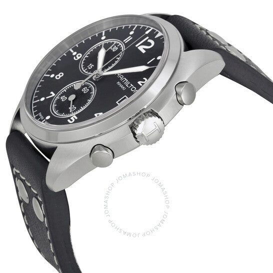 Stainless steel case with a black leather strap. Fixed stainless steel bezel. Black dial with luminous hands and Arabic numeral hour markers. Minute markers around the outer rim. Dial Type: Analog. Luminescent hands and markers. Date display at the 3 o'clock position. Chronograph - two sub-dials displaying: 60 second and 30 minute. Quartz movement. Scratch resistant sapphire crystal. Solid case back. Case diameter: 41 mm. Round case shape. Band width: 22 mm. Tang clasp. Water resistant at 100 meters / 330 feet. Functions: chronograph, date, hour, minute, second. Casual watch style. Watch label: Swiss Made. Hamilton Khaki Pilot Pioneer Chronograph Black Dial Black Leather Men's Watch H76512733.
