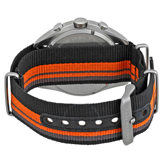 Stainless steel case with a striped nylon NATO strap. Fixed stainless steel bezel. Black dial with luminous silver-tone hands and Arabic numeral hour markers. Minute markers around the outer rim. Dial Type: Analog. Luminescent hands and markers. Date display at the 3 o'clock position. Two sub-dials displayings: 60 seconds and 30 minutes. Quartz movement. Scratch resistant sapphire crystal. Solid case back. Case diameter: 41 mm. Case thickness: 13 mm. Round case shape. Band width: 22 mm. Tang clasp. Water resistant at 100 meters / 330 feet. Casual watch style. Hamilton Khaki Pioneer Pilot Black Dial Men Watch H76552933.