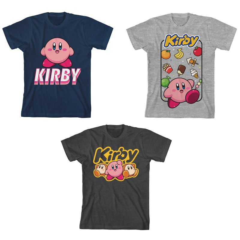 - CUSTOM DESIGN: Cute images of Kirby surrounded by foodstuff and Waddle Dees decorate the graphic t-shirts in this 3-pack, so kids can celebrate the charm of their favorite video game character in style.