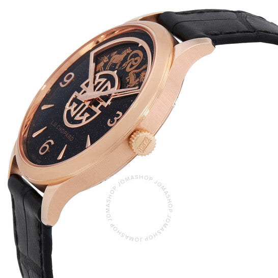 18kt rose gold case with a black alligator leather strap. Fixed 18kt rose gold bezel. Black dial with rose gold hands and index-Arabic numeral hour markers. Dial Type: Analog. One subdial displaying: animal zodiac. Chopard Calibre L.U.C 96.29-L Automatic movement, containing 29 Jewels, bitting at 28800 vph, and has a power reserve of approximately 65 hours. Scratch resistant sapphire crystal. Transparent case back. Round case shape, case size: 40 mm. Tang clasp. Water resistant at 30 meters / 100 feet. Functions: GMT, hour, minute. L.u.c Series. Luxury watch style. Watch label: Swiss Made. Chopard L.U.C XP Urushi Spirit Automatic Black Dial Men's Watch 161980-5001.