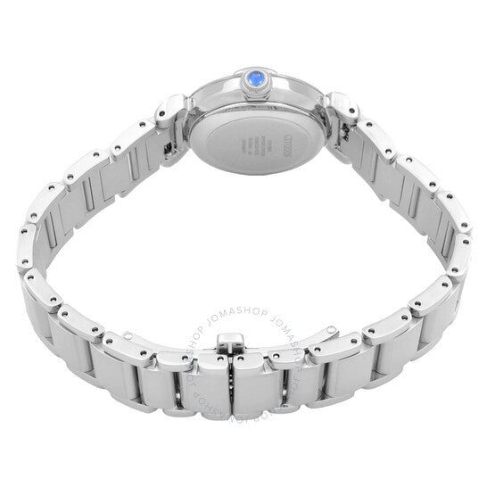 Silver-tone stainless steel case and bracelet. Fixed silver-tone stainless steel bezel. Green dial with silver-tone hands and Arabic numeral hour markers. Dial Type: Analog. Citizen Caliber Eco-Drive E031 eco-drive movement. Scratch resistant sapphire crystal. Pull / push crown. Solid case back. Round case shape, case size: 26 mm. Deployment with push button release clasp. Water resistant at 50 meters / 165 feet. Functions: hour, minute, second, solar-powered. Citizen L Series. Dress watch style. Watch label: Japan Movt. Citizen L May Bells Eco-Drive Green Dial Ladies Watch EM1130-83X.