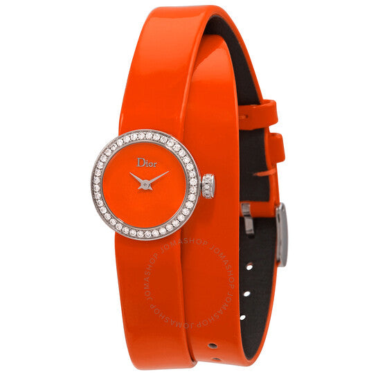 Stainless steel case with a orange leather (double wrap) strap. Fixed stainless steel bezel. Orange dial with silver-tone hands. No markers. Dial Type: Analog. Quartz movement. Scratch resistant sapphire crystal. Pull / push crown. Solid case back. Round case shape. Case size: 19 mm. Case thickness: 7 mm. Band width: 11 mm. Band length: 7 inches. Tang clasp. Water resistant at 30 meters / 100 feet. Functions: hour, minute. La D De Dior Series. Luxury watch style. Dior La D De Dior Quartz Orange Dial Ladies Watch CD040110A022.