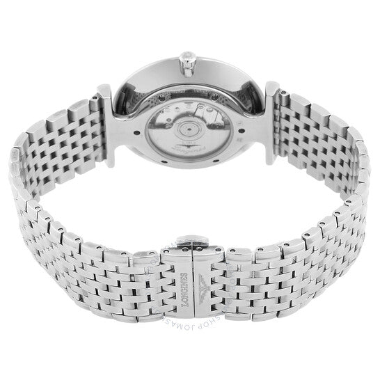 Silver-tone stainless steel case and bracelet. Fixed silver-tone stainless steel bezel. Black dial with silver-tone hands and Roman numeral hour markers. Dial Type: Analog. Longines Calibre L591 Automatic movement, based upon ETA A20.L01, containing 22 Jewels, bitting at 28800 vph, and has a power reserve of approximately 40 hours. Scratch resistant sapphire crystal. Transparent see through case back. Round case shape, case size: 38 mm. Fold over clasp. Water resistant at 30 meters / 100 feet. Functions: hour, minute. Additional Info: original box, international warranty card, manual (complete accessories). La Grande Series. Luxury watch style. Watch label: Swiss Made. Longines La Grande Automatic Black Dial Men's Watch L4.918.4.51.6.