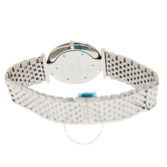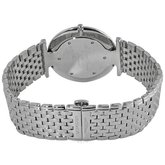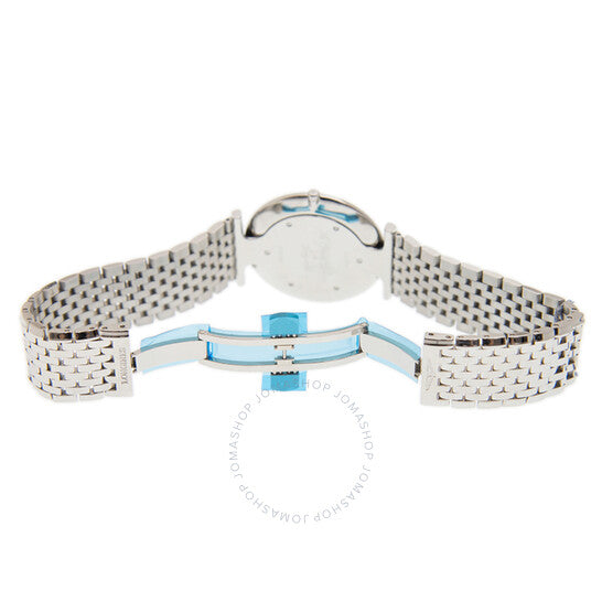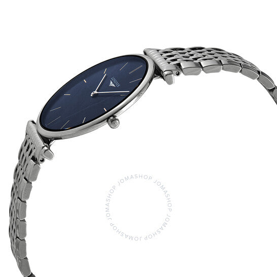 Stainless steel case with a stainless steel bracelet. Fixed stainless steel bezel. Blue dial with silver-tone hands and index hour markers. Dial Type: Analog. Longines Calibre L420 quartz movement. Scratch resistant sapphire crystal. Pull / push crown. Solid case back. Round case shape. Case size: 36 mm. Case thickness: 5.29 mm. Triple fold over clasp with a safety release. Water resistant at 30 meters / 100 feet. Functions: hour, minute. Dress watch style. Watch label: Swiss Made. Longines La Grande Classique de Longines Quartz Blue Dial Ladies Watch L4.755.4.95.6.