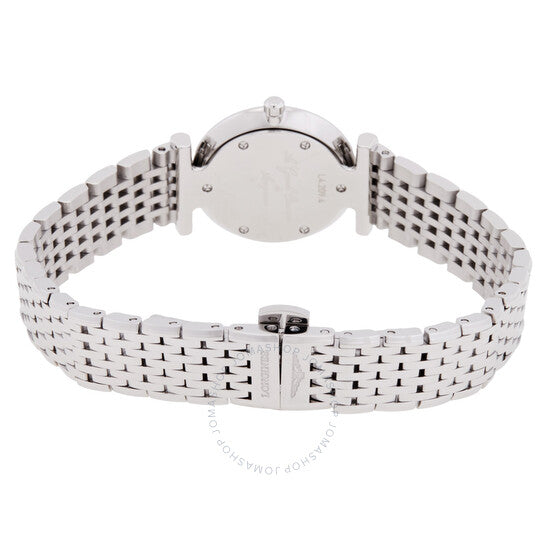 Silver-tone stainless steel case and bracelet. Fixed silver-tone stainless steel bezel. Sunray blue dial with silver-tone hands and 12 Top Wesselton VS-SI diamond markers, for a total of 0.048 carats. Dial Type: Analog. Longines Calibre L209 quartz movement. Scratch resistant sapphire crystal. Pull / push crown. Solid case back. Round case shape, case size: 24 mm, case thickness: 4.3 mm. Band width: 13 mm. Fold over clasp with a safety release. Water resistant at 30 meters / 100 feet. Functions: hour, minute. La Grande Classique Series. Dress watch style. Watch label: Swiss Made. Longines La Grande Classique Quartz Blue Dial Ladies Watch L4.209.4.97.C.