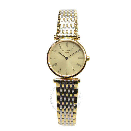 Yellow gold-tone stainless steel case with a black leather strap. Fixed yellow gold-tone stainless steel bezel. Champagne dial with black hands and Roman numeral hour markers. Dial Type: Analog. Longines Calibre L209 quartz movement. Scratch resistant sapphire crystal. Solid case back. Round case shape, case size: 24.5 mm. Deployment clasp. Water resistant at 30 meters / 100 feet. Functions: hour, minute. Additional Info: original box, international warranty card, manual (complete accessories). La Grande Classique Series. Luxury watch style. Watch label: Swiss Made. Item Variations: L4 209 2 31 7, L4-209-2-31-7, L4/209/2/31/7, L42092317. Longines La Grande Classique Quartz Champagne Dial Ladies Watch L4.209.2.31.7.