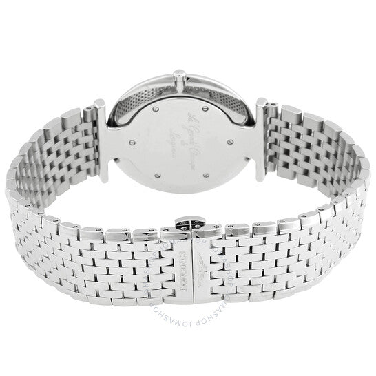 Stainless steel case with a stainless steel bracelet. Fixed stainless steel bezel. Blue dial with silver-tone hands and diamond hour markers. Dial Type: Analog. Quartz movement. Scratch resistant sapphire crystal. Pull / push crown. Solid case back. Round case shape, case size: 36 mm, case thickness: 7.6 mm. Band width: 20 mm. Hidden fold over clasp. Water resistant at 30 meters / 99 feet. Functions: hour, minute. La Grande Classique Series. Dress watch style. Watch label: Swiss Made. Longines La Grande Classique Quartz Diamond Blue Dial Men's Watch L4.755.4.97.6.