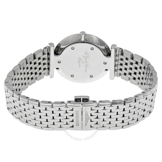 Silver-tone stainless steel case and bracelet. Fixed silver-tone stainless steel bezel. White dial with black hands and Roman numeral hour markers. Dial Type: Analog. Longines Calibre L420 quartz movement. Scratch resistant sapphire crystal. Pull / push crown. Solid case back. Round case shape, case size: 29 mm, case thickness: 5 mm. Band width: 16 mm. Hidden fold over clasp. Water resistant at 30 meters / 100 feet. Functions: hour, minute. La Grande Classique Series. Casual watch style. Watch label: Swiss. Item Variations: L4 512 4 11 6, L4-512-4-11-6, L4/512/4/11/6, L45124116. Longines La Grande White Dial Stainless Steel Men's Watch L45124116.