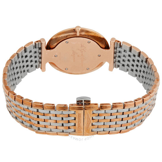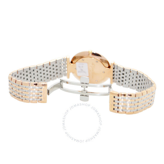Rose gold PVD stainless steel case with a two-tone (silver-tone and rose gold PVD) stainless steel bracelet. Fixed rose gold PVD stainless steel bezel. White dial with black hands and Roman numeral hour markers. Dial Type: Analog. Longines Calibre L420 quartz movement. Scratch resistant sapphire crystal. Pull / push crown. Solid case back. Round case shape, case size: 33 mm, case thickness: 5 mm. Band width: 20.3 mm, band length: 6 inches. Hidden fold over deployment clasp. Water resistant at 30 meters / 100 feet. Functions: hour, minute. La Grande Classique Series. Dress watch style. Watch label: Swiss. Item Variations: L4.709.1.91.7. Longines La Grande Classique Quartz White Dial Ladies Watch L4.709.1.91.7.