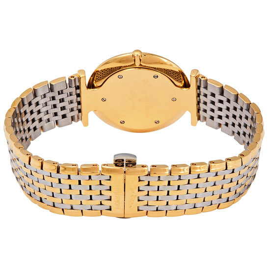 Yellow gold PVD stainless steel case with a two-tone (silver-tone and yellow gold PVD) stainless steel bracelet. Fixed yellow gold PVD bezel. White dial with black hands and Roman numeral hour markers. Dial Type: Analog. Longines calibre L420 quartz movement. Scratch resistant sapphire crystal. Pull / push crown. Solid case back. Round case shape. Case size: 33 mm. Case thickness: 4.5 mm. Band width: 18 mm. Fold over clasp with a push button release. Water resistant at 30 meters / 100 feet. Functions: hour, minute. La Grande Classique Series. Dress watch style. Watch label: Swiss Made. Longines La Grande Classique Quartz White Dial Ladies Watch L4.709.2.21.7.