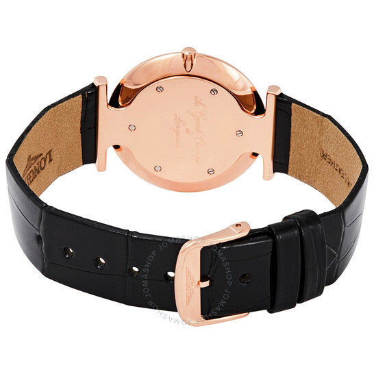 Rose gold PVD stainless steel case with a black alligator leather strap. Fixed rose gold-tone stainless steel bezel. White dial with rose gold-tone hands and Roman numeral hour markers. Dial Type: Analog. Longines Calibre L420 quartz movement. Scratch resistant sapphire crystal. Pull / push crown. Solid case back. Round case shape. Case size: 33 mm. Buckle clasp. Water resistant at 30 meters / 100 feet. Functions: hour, minute. Dress watch style. Watch label: Swiss Made. Item Variations: L47091212. Longines La Grande Classique White Dial Ladies Leather Watch L4.709.1.21.2.