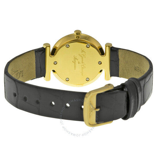 Yellow gold PVD stainless steel case with a black (alligator) leather strap. Fixed yellow gold PVD bezel. White dial with black hands and Roman numeral hour markers. Dial Type: Analog. Longines calibre L209 quartz movement. Scratch resistant sapphire crystal. Pull / push crown. Solid case back. Round case shape. Case size: 24 mm. Case thickness: 5 mm. Band width: 15 mm. Band length: 6 inches. Tang clasp. Water resistant at 30 meters / 100 feet. Functions: hour, minute. Dress watch style. Watch label: Swiss Made. Item Variations: L4 209 2 11 2, L4-209-2-11-2, L4/209/2/11/2, L42092112. Longines La Grande Classique White Dial Ladies Watch L4.209.2.11.2.