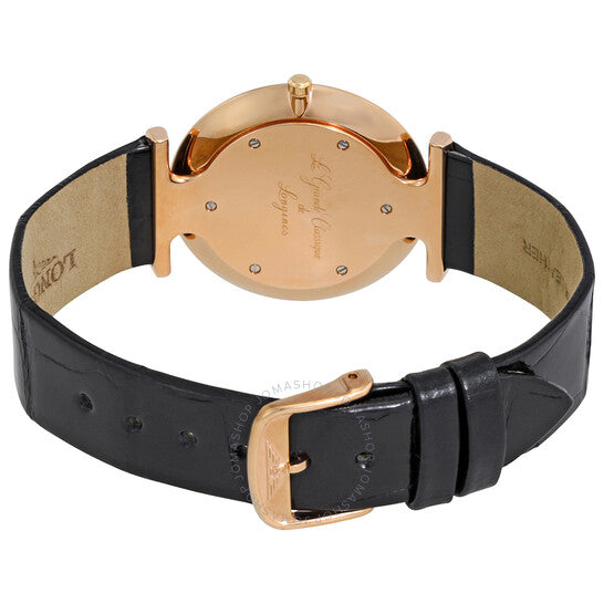 . 18kt rose gold PVD stainless steel case with a black leather strap. Fixed 18kt rose gold PVD bezel. White dial with black hands and Roman numeral hour markers. Dial Type: Analog. Longines calibre L420 quartz movement. Scratch resistant sapphire crystal. Pull / push crown. Solid case back. Case size: 33 mm. Case thickness: 5 mm. Round case shape. Band width: 20.3 cm. Band length: 8 inches. Tang clasp. Water resistant at 30 meters / 100 feet. Functions: hour, minute. Dress watch style. Watch label: Swiss Made. Item Variations: L4.709.1.91.2. Longines La Grande Classique White Dial Ladies Watch L47091912.