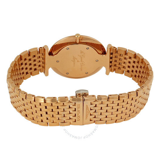 18kt rose gold PVD stainless steel case and bracelet. Fixed 18kt rose gold PVD bezel. White dial with black hands and Roman numeral hour markers. Dial Type: Analog. Longines calibre L420 quartz movement. Scratch resistant sapphire crystal. Pull / push crown. Solid case back. Case size: 33 mm. Case thickness: 5 mm. Round case shape. Band width: 20.3 mm. Band length: 6 inches. Hidden fold over deployment clasp. Water resistant at 30 meters / 100 feet. Functions: hour, minute. Dress watch style. Watch label: Swiss. Longines La Grande Classique White Dial Ladies Watch L47091918.