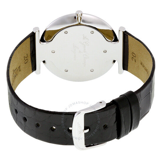 Stainless steel case with a black (alligator) leather strap. Fixed stainless steel bezel. White dial with black hands and Roman numeral hour markers. Dial Type: Analog. Swiss quartz movement. Scratch resistant sapphire crystal. Pull / push crown. Solid case back. Case diameter: 36 mm. Case thickness: 6 mm. Round case shape. Band width: 20 mm. Tang clasp. Water resistant at 50 meters / 165 feet. Functions: hour, minute. Dress watch style. Longines La Grande Classique White Dial Black Leather Ladies Watch L47554112.