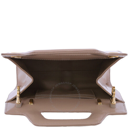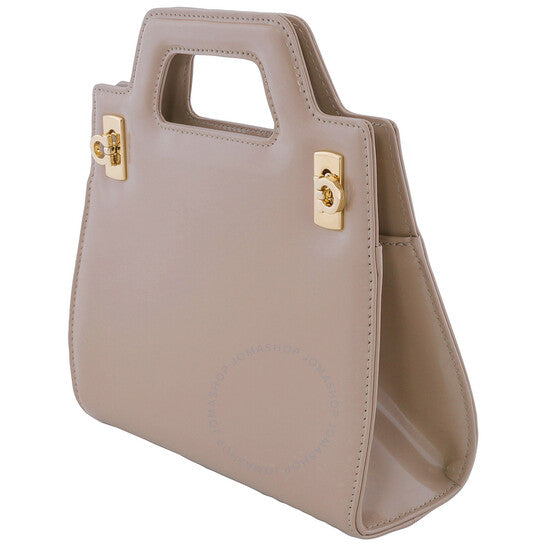 Ferragamo Ladies Shoulder Bag. SKU: 213485 762495. Barcode: 8056283168168. Color: Beige. Size: 8cm x 18cm x 6cm. Ferragamo Ladies Beige Wanda Leather Mini Bag. Crafted from smooth calfskin, this mini bag features an integrated handle, main compartment with card slots, designed with geometric lines, a detachable shoulder strap, and complemented by satin-finish Gancini buckles on the sides. Material: Calfskin. Made in Italy.
