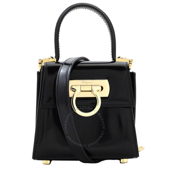Ferragamo Ladies Handbag. SKU: 213972 762967. Barcode: 8056283172684. Color: Black. Ferragamo Ladies Black Micro Iconic Top Handle Bag. Crafted from glossy leather, this micro-sized bag features a structured silhouette and geometric brushed panels. It is complemented by a golden Gancini fastening, a rigid handle, and a detachable shoulder strap. The front flap is secured with the Gancini clasp, while the bag includes two main compartments and metal feet for added protection. Made in Italy.
