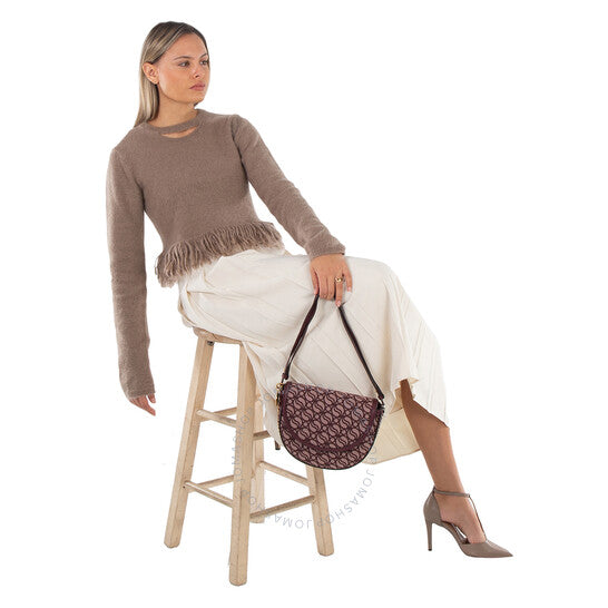 Stella Mccartney Ladies Shoulder Bag. SKU: 7B0006WP0064-6106. Barcode: 3666015481820. Color: Burgundy. Size: 22x17.5x6 cm. Stella Mccartney Ladies Burgundy Frayme Medium S-Wave Flap Shoulder Bag. The Frayme shoulder bag showcases a signature silver and gold diamond-cut chain, a flap closure with a press-stud fastening, and the iconic Stella McCartney S-Wave monogram pattern throughout. It also includes an inner slip pocket for added functionality. Material: 90% Recycled Polyester, 10% Polyurethane. Made in Italy.
