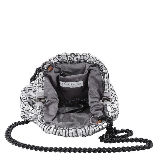 Maria La Rosa Ladies Clutch. SKU: BR22.23 MLR. Barcode: 2004005335158. Color: Ribbon Laminated Silver. Size: Width 22 cm x Height 16 cm x Depth 8 cm. Maria La Rosa Ladies Ribbon Laminated Silver Mini Game Clutch. Woven from ribbon fabric, this clutch features a matching chain strap and a main compartment. Made in Italy.