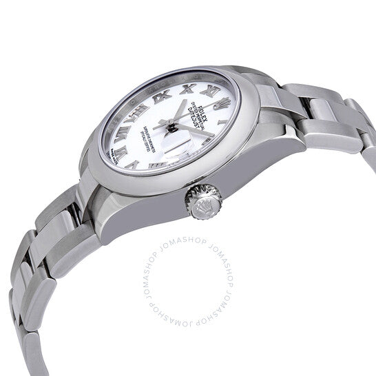 Silver-tone stainless steel case with a silver-tone stainless steel rolex oyster bracelet. Fixed - domed silver-tone stainless steel bezel. White dial with silver-tone hands and Roman numeral hour markers. Dial Type: Analog. Date display at the 3 o'clock position. Rolex Calibre 2236 automatic movement with a 55-hour power reserve. Scratch resistant sapphire crystal. Screw down crown. Solid case back. Round case shape. Case size: 28 mm. Fold over with safety release clasp. Water resistant at 100 meters / 330 feet. Functions: date, hour, minute, second. Luxury watch style. Watch label: Swiss Made. Rolex Lady Datejust Automatic White Dial Ladies Oyster Watch 279160WRO.