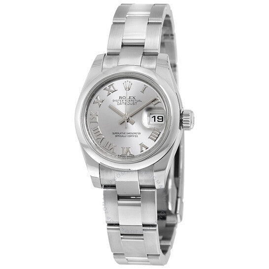 Stainless steel case with a stainless steel Rolex oyster bracelet. Fixed domed bezel. Rhodium dial with silver-tone hands and Roman numeral hour markers. Minute markers around the outer rim. Dial Type: Analog. Date display at the 3 o'clock position. Rolex Calibre 2235 automatic movement with a 48-hour power reserve. Scratch resistant sapphire crystal. Screw down crown. Solid case back. Case size: 26 mm. Round case shape. Concealed crown clasp. Water resistant at 100 meters / 330 feet. Functions: hours, minutes, seconds, date. Luxury watch style. Watch label: Swiss Made. Rolex Lady Datejust Rhodium Dial Automatic Oyster Ladies Watch 179160RRO.