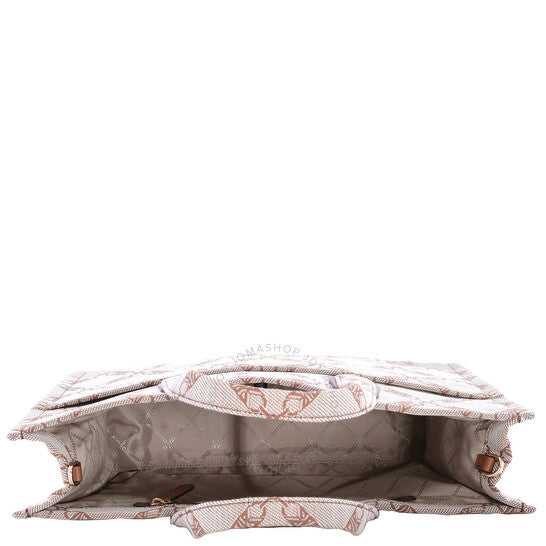 Michael Kors Ladies Tote. SKU: 30S3G3GT3J-969. Color: Nat/Lugg. Size: 15. 5" X 11. 75" X 5. 25". Michael Kors Large Gigi Empire Logo Jacquard Tote Bag. This logo-print tote bag features a gold-tone metallic hardware with a logo print on the front and a monogram pattern. It has a polyester lining, one main compartment, one zip pocket, two slip pockets, and two handles. It also includes a removable and adjustable shoulder strap. 53. 2%Cotton , 46. 8%Polyester.