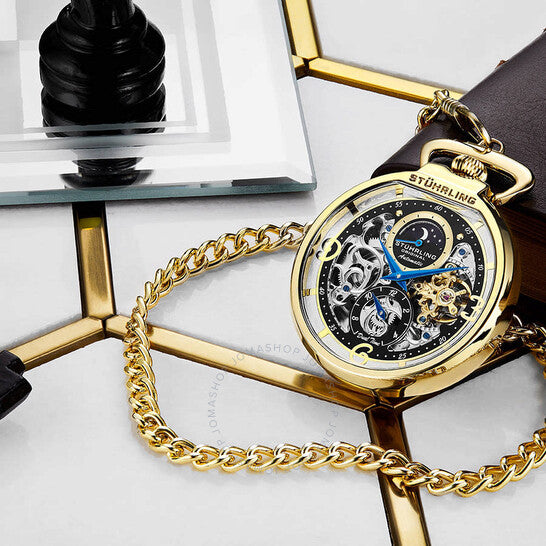 Yellow gold-tone alloy case with a yellow gold-tone stainless steel bracelet. Fixed yellow gold-tone alloy bezel. Black dial with blue hands and Arabic numeral hour markers. Dial Type: Analog. Automatic movement. Scratch resistant mineral crystal. Pull / push crown. Transparent case back. Round case shape, case size: 48 mm, case thickness: 12.6 mm. Water resistant at 50 meters / 165 feet. Functions: hour, minute. Dress watch style. Stuhrling Original Legacy Automatic Black Dial Men's Watch Stuhrling Original Legacy Automatic Black Dial Men's Watch M13551