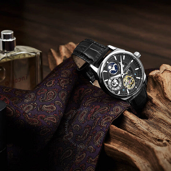 Silver-tone alloy case with a black leather strap. Fixed silver-tone alloy bezel. Black (open heart) dial with luminous silver-tone dauphine-style hands and index hour markers. Minute markers around the outer rim. Dial Type: Analog. Luminescent hands and markers. Two sub-dials displaying: am/pm indicator and 24 hour. Automatic movement. Scratch resistant mineral crystal. Pull / push crown. Transparent case back. Round case shape. Case size: 42.5 mm. Case thickness: 13.25 mm. Band width: 20 mm. Band length: 8.5 inches. Tang clasp. Water resistant at 50 meters / 165 feet. Functions: hour, minute, am/pm indicator, 24 hour. Legacy Series. Dress watch style. Stuhrling Original Legacy Automatic Black Dial Men's Watch M13599.