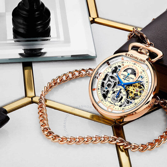 Rose gold-tone alloy case with a rose gold-tone stainless steel bracelet. Fixed rose gold-tone alloy bezel. Champagne dial with blue hands and Arabic numeral hour markers. Dial Type: Analog. Automatic movement. Scratch resistant mineral crystal. Pull / push crown. Transparent case back. Round case shape, case size: 48 mm, case thickness: 12.6 mm. Water resistant at 50 meters / 165 feet. Functions: hour, minute. Dress watch style. Stuhrling Original Legacy Automatic Champagne Dial Men's Watch Stuhrling Original Legacy Automatic Champagne Dial Men's Watch M13524