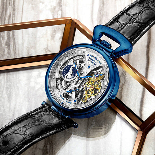 Blue alloy case with a black leather strap. Fixed blue alloy bezel. Silver-tone dial with blue Breguet-style shape hands and index hour markers. Minute markers around the outer rim. Dial Type: Analog. Two - am/pm indicator, dual time subdials. Automatic movement. Scratch resistant mineral crystal. Pull / push crown. Transparent case back. Round case shape, case size: 46 mm, case thickness: 13.25 mm. Band length: 9 inches. Buckle clasp. Water resistant at 50 meters / 165 feet. Functions: hour, minute, am/pm indicator, dual time. Dress watch style. Stuhrling Original Legacy Automatic Silver Dial Men's Watch M13569.