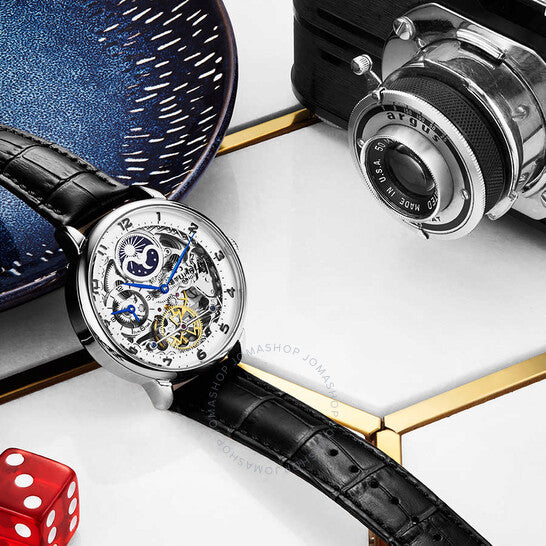 Silver-tone alloy case with a black leather strap. Fixed silver-tone alloy bezel. Silver (skeleton center) dial with blue leaf-style hands and Arabic numeral hour markers. Minute markers around an inner ring. Dial Type: Analog. Two sub-dials displaying: am/pm indicator and 24 hour (dual time). Automatic movement. Scratch resistant mineral crystal. Pull / push crown. Transparent case back. Round case shape. Case size: 40 mm. Case thickness: 12.5 mm. Band width: 22 mm. Band length: 8.25 inches. Tang clasp. Water resistant at 50 meters / 165 feet. Functions: hour, minute, am/pm indicator, dual time. Legacy Series. Dress watch style. Stuhrling Original Legacy Automatic Silver Dial Men's Watch M13600.