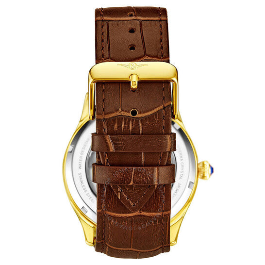 Yellow gold-tone alloy case with a brown leather strap. Fixed yellow gold-tone alloy bezel. White skeleton dial with gold-tone leaf-style hands and index hour markers. Arabic numerals mark the 3, 6, 9 and 12 o'clock positions. Minute markers around the outer rim. Dial Type: Analog. Two displays showing: am/pm indicator and 24 hour (dual time). Automatic movement. Scratch resistant mineral crystal. Pull / push crown. Transparent case back. Round case shape. Case size: 44 mm. Case thickness: 12.5 mm. Band width: 22 mm. Band length: 8.5 inches. Tang clasp. Water resistant at 50 meters / 165 feet. Functions: hour, minute, am/pm indicator,dual time. Legacy Series. Dress watch style. Stuhrling Original Legacy Automatic White Dial Men's Watch M13594.