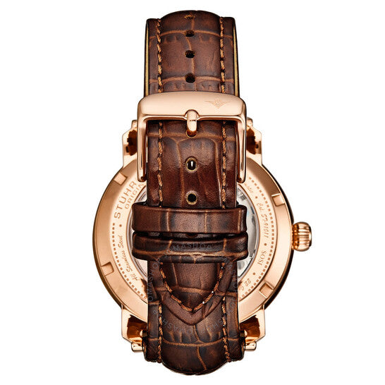 Rose Gold Case - Gun Metal Dial - Rose Gold Hands - Rose Gold Crown - Brown Strap Rose gold-tone stainless steel case with a brown leather strap. Fixed rose gold-tone stainless steel bezel. Brown dial with rose gold-tone hands and Arabic numeral & index hour markers. Minute markers around the outer rim. Dial Type: Analog. Automatic movement. Round case shape, case size: 44 mm. Tang clasp. Water resistant at 50 meters / 165 feet. Functions: chronograph, hour, minute, second. Legacy Series. Dress watch style. Stuhrling Original Legacy Chronograph Automatic Brown Dial Men's Watch M18235.