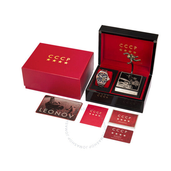 Silver-tone stainless steel case and bracelet. Fixed silver-tone stainless steel bezel. Blue dial with silver-tone hands and index hour markers. Minute markers around the outer rim. Dial Type: Analog. Luminescent hands and markers. Date display at the 3 o'clock position. Automatic movement. Scratch resistant mineral crystal. Transparent case back. Round case shape, case size: 43 mm, case thickness: 14 mm. Band width: 20 mm, band length: 8 inches. Fold over clasp with a safety release. Functions: date, hour, minute, second. Leonov Series. Fashion watch style. CCCP Leonov Automatic Blue Dial Men's Watch CP-7099-22.
