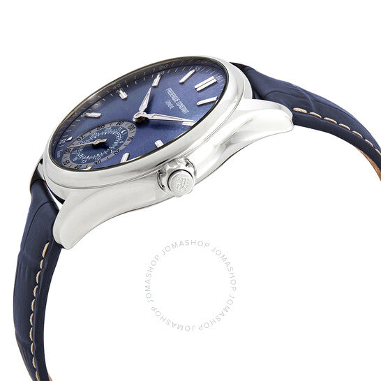 Stainless steel case with a blue (calfskin) leather strap. Fixed stainless steel bezel. Light blue dial with luminous silver-tone alpha-style hands and index hour markers. Arabic numeral minute markers (at 5 minute intervals). Minute markers around the outer rim. Dial Type: Analog. Luminescent hands and markers. Combination date and 1/100th of a second sub-dial. Frederique Constant calibre MMT-285 quartz movement. Scratch resistant convex sapphire crystal. Pull / push crown. Solid case back. Round case shape. Case size: 42 mm. Case thickness: 13 mm. Band width: 18 mm. Fold over clasp with a push button release. Water resistant at 50 meters / 165 feet. Functions: date, hour, minute, second. Additional Info: via ios and android smart devices for activity tracking, active alerts, dynamic coaching, sleep monitoring worldtimer, and cloud storage. Horological Series. Smart watch style. Watch label: Swiss Made. Frederique Constant Light Blue Dial Men's Horological Smartwatch Men's FC-285LNS5B6.