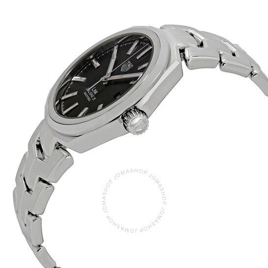 Stainless steel case with a stainless steel bracelet. Fixed stainless steel bezel. Black dial with luminous silver-tone hands and index hour markers. Minute markers around the outer rim. Dial Type: Analog. Luminescent hands and markers. Date display at the 3 o'clock position. TAG Heuer calibre 5 automatic movement, based upon ETA 2824-2, containing 26 Jewels, bitting at 28800 vph, and has a power reserve of approximately 38 hours. Scratch resistant sapphire crystal. Screw down crown. Transparent case back. Round case shape. Case size: 41 mm. Case thickness: 13 mm. Bracelet width: 20 mm. Fold over clasp with a safety release. Water resistant at 100 meters / 330 feet. Functions: date, hour, minute, second. Casual watch style. Watch label: Swiss Made. Tag Heuer Link Automatic Black Dial Men's Watch WBC2110.BA0603.