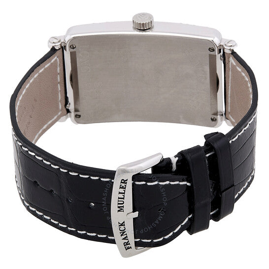 Silver-tone stainless steel case with a black leather strap. Fixed silver-tone bezel with stainless steel diamond set. Black dial with Arabic numeral hour markers. Dial Type: Analog. Automatic movement. Scratch resistant sapphire crystal. Solid case back. Rectangle case shape, case size: 30 mm. Buckle clasp. Water resistant at 30 meters / 100 feet. Functions: hour, minute. Long Island Series. Luxury watch style. Watch label: Swiss Made. Franck Muller Long Island Automatic Diamond Black Dial Ladies Watch 1000 SC D AC.
