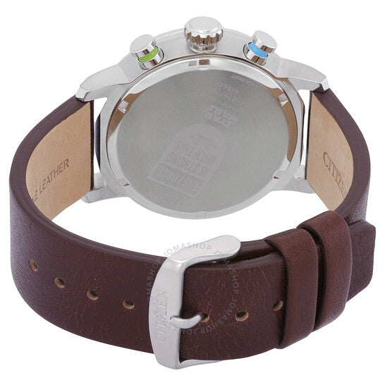 Silver-tone stainless steel case with a brown leather strap. Blue stainless steel bezel. Blue dial with silver-tone hands and index hour markers. Minute markers around the outer rim. Dial Type: Analog. Date display at the 3 o'clock position. Chronograph - three sub-dials displaying: 60 second, 60 minute and 24 hour. Citizen Caliber Eco-Drive B612 eco-drive movement. Scratch resistant mineral crystal. Solid case back. Round case shape, case size: 44 mm. Band width: 22 mm. Buckle clasp. Water resistant at 100 meters / 330 feet. Functions: chronograph, date, hour, minute, second, solar-powered. Luke Skywalker Series. Sport watch style. Watch label: Japan Movt. Citizen Luke Skywalker Chronograph Blue Dial Men's Watch CA0768-07W.