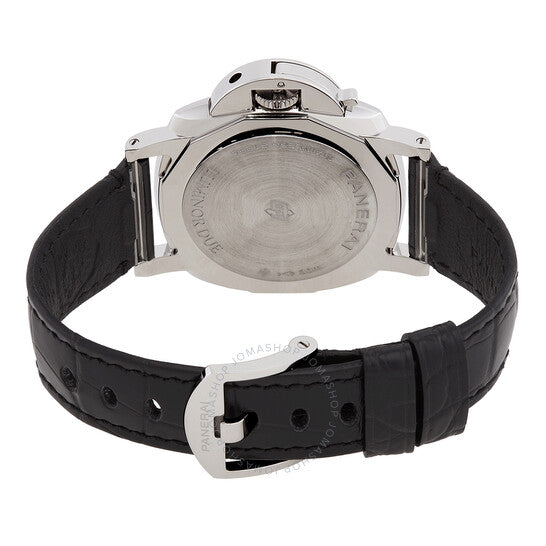 Silver-tone stainless steel case with a black alligator leather strap. Fixed silver-tone stainless steel bezel. White dial with rose gold-tone hands and index-Arabic numeral hour markers. Arabic numeral marker appears at the 6 and 12 o'clock positions. Dial Type: Analog. Luminescent hands and markers. Date display at the 3 o'clock position. One subdial displaying: small second. Panerai Calibre P.900 Automatic movement, based upon Panerai OP XXXIV, containing 25 Jewels, bitting at 28800 vph, and has a power reserve of approximately 72 hours. Scratch resistant sapphire crystal. Solid case back. Cushion case shape, case size: 42 mm. Water resistant at 50 meters / 165 feet. Functions: date, hour, minute, small second. Luminor Due Series. Luxury watch style. Watch label: Swiss Made. Panerai Luminor Due Automatic White Dial Men's Watch PAM01388.